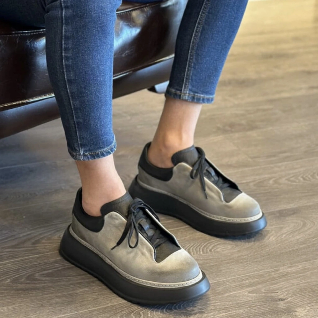 Erkek Gri Deri Sneaker – Siyah Kalın Taban
