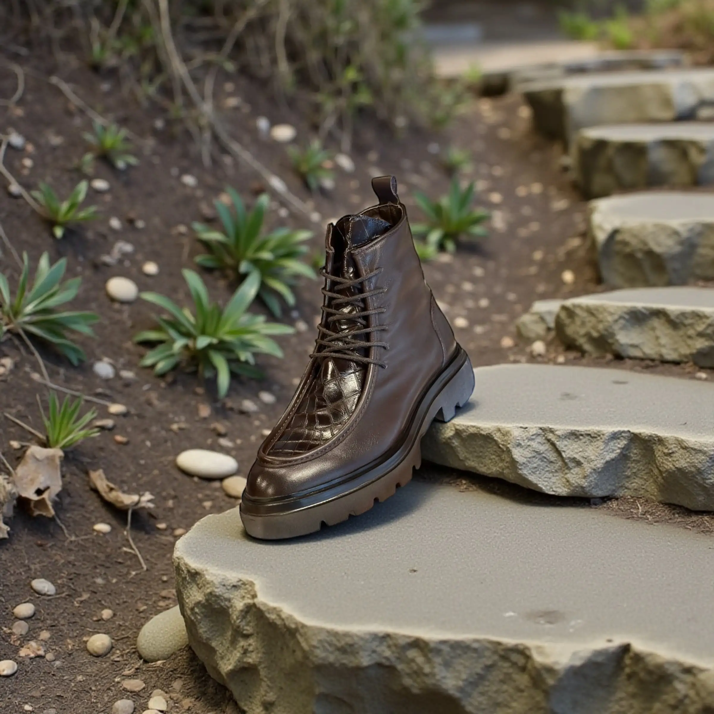Hakiki kahve deri, krokodil detay ve kalın taban yapısıyla şık ve dayanıklı erkek bot modeli.