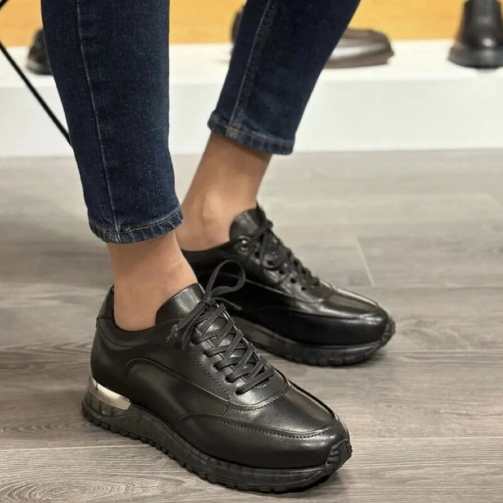 Günlük kullanımda hem konfor hem de şık bir görünüm arayan erkekler için tasarlanan bu siyah spor ayakkabı, modern detayları ve güçlü yapısıyla dikkat çeker. Kaliteli deri yüzeyi uzun süreli kullanımda formunu korurken, parlak ve pürüzsüz yapısı modele premium bir hava kazandırır.