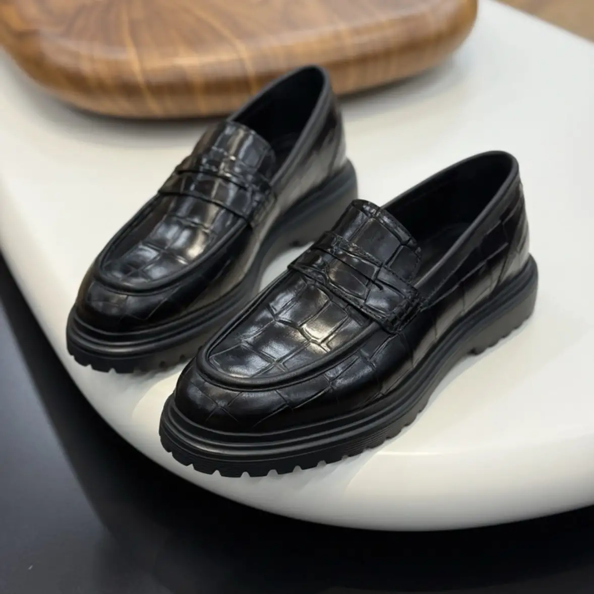 Siyah Kroko Desenli Hakiki Deri Loafer – Eva Taban